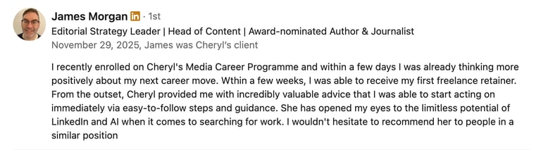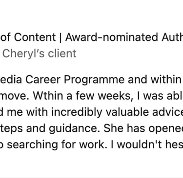 I contacted Cheryl to get some support to find work. During our session I received a lot of useful advice on how to position myself in various industries and perform effective job searches. Cheryl's unique perspective as a recruiter in the Media industry was invaluable and her strategic outlook made me think about things in a business sense. I would highly recommend Cheryl's one-to-one coaching services.